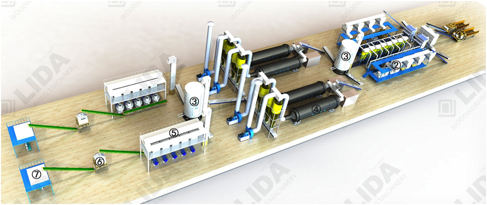 Keterangan Gambar: 1) Ketam Kayu; 2) Mesin Lumat (serbuk); 3) Bin (alat tampung); 4) Pengering; 5) Mesin pelet; 6) Pendingin; 7) Mesin Pengepakan.